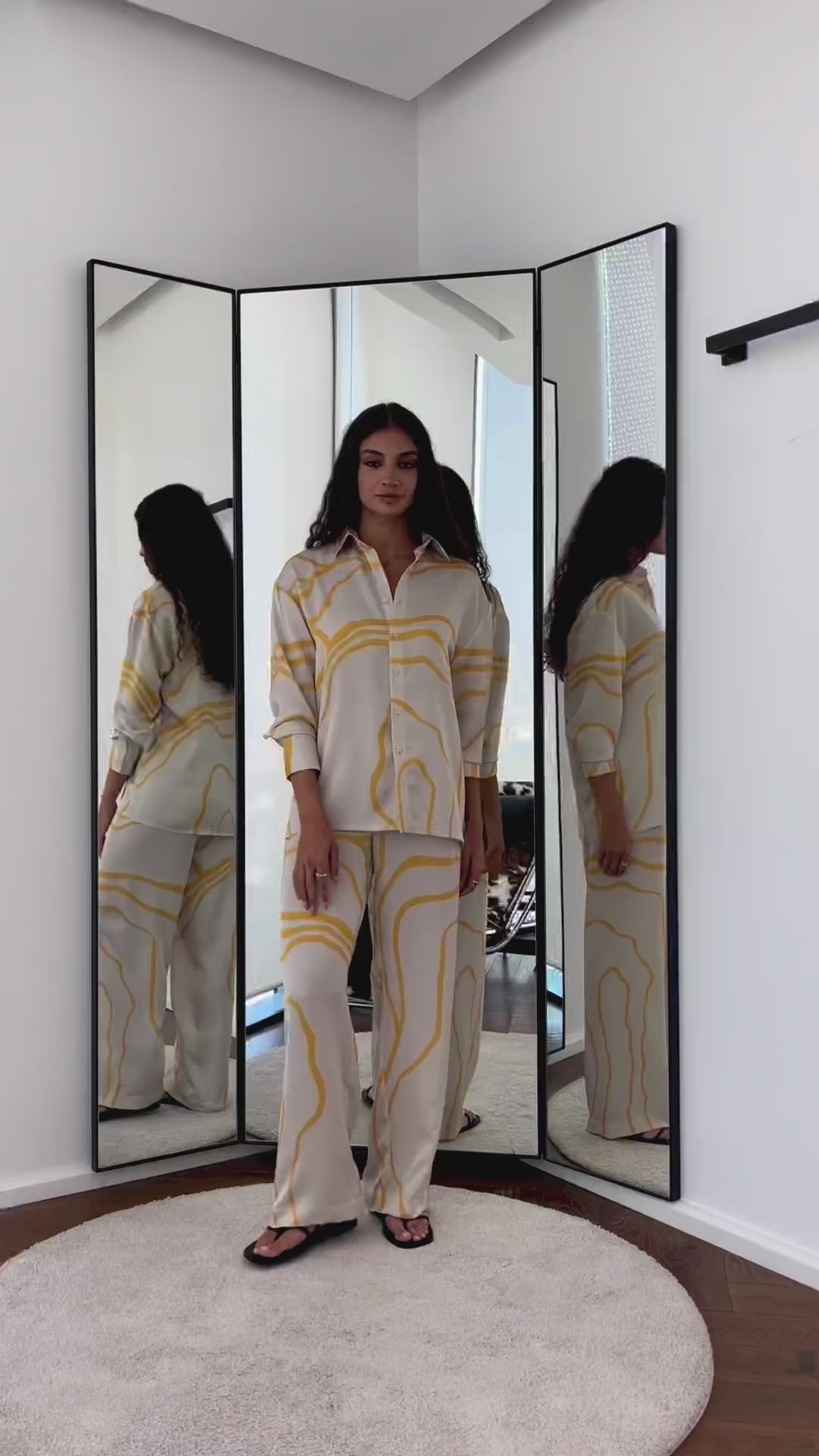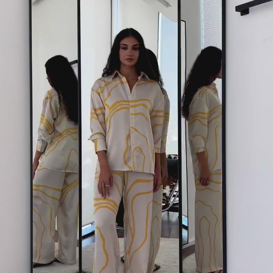 Step into bold sophistication with the Abstract Line Print Co-ord Set from LayrLuxe. Crafted in a fluid satin blend, this set effortlessly combines comfort and modern elegance. The relaxed-fit shirt and flowy wide-leg trousers are adorned with artistic abstract line patterns, giving a statement look that’s both minimalist and chic.