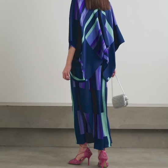 Drape yourself in modern elegance with the Azure Waves Kaftan Co-ord Set from LayrLuxe. Crafted in fluid satin fabric, this captivating ensemble blends flowing silhouettes with geometric artistry, featuring a rich palette of deep navy, aqua, and violet hues.