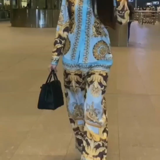 Channel pure opulence with the Baroque Luxe Satin Co-ord Set from LayrLuxe. Inspired by Italian luxury fashion, this statement ensemble features an intricate gold baroque print over a soft turquoise base, giving you a regal yet modern edge.