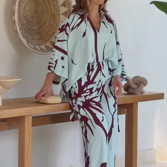 The relaxed-fit kaftan-style top drapes gracefully with subtle structure, while the wide-leg trousers create a fluid silhouette that moves with ease. Whether you're stepping out for a resort brunch or a city soirée, this set exudes quiet confidence and refined elegance.