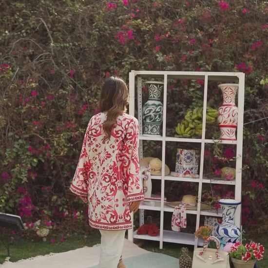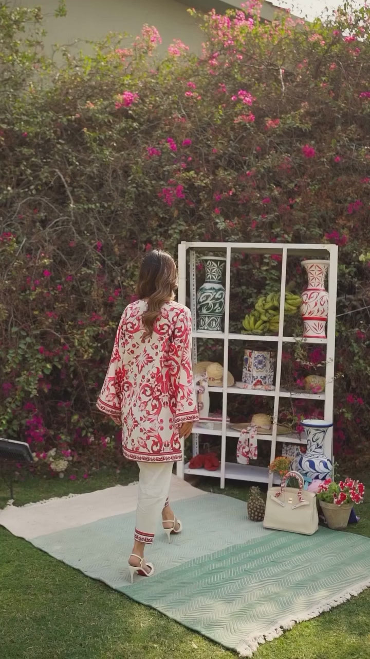 Crimson Bloom Printed Co-ord Set – Ivory & Red