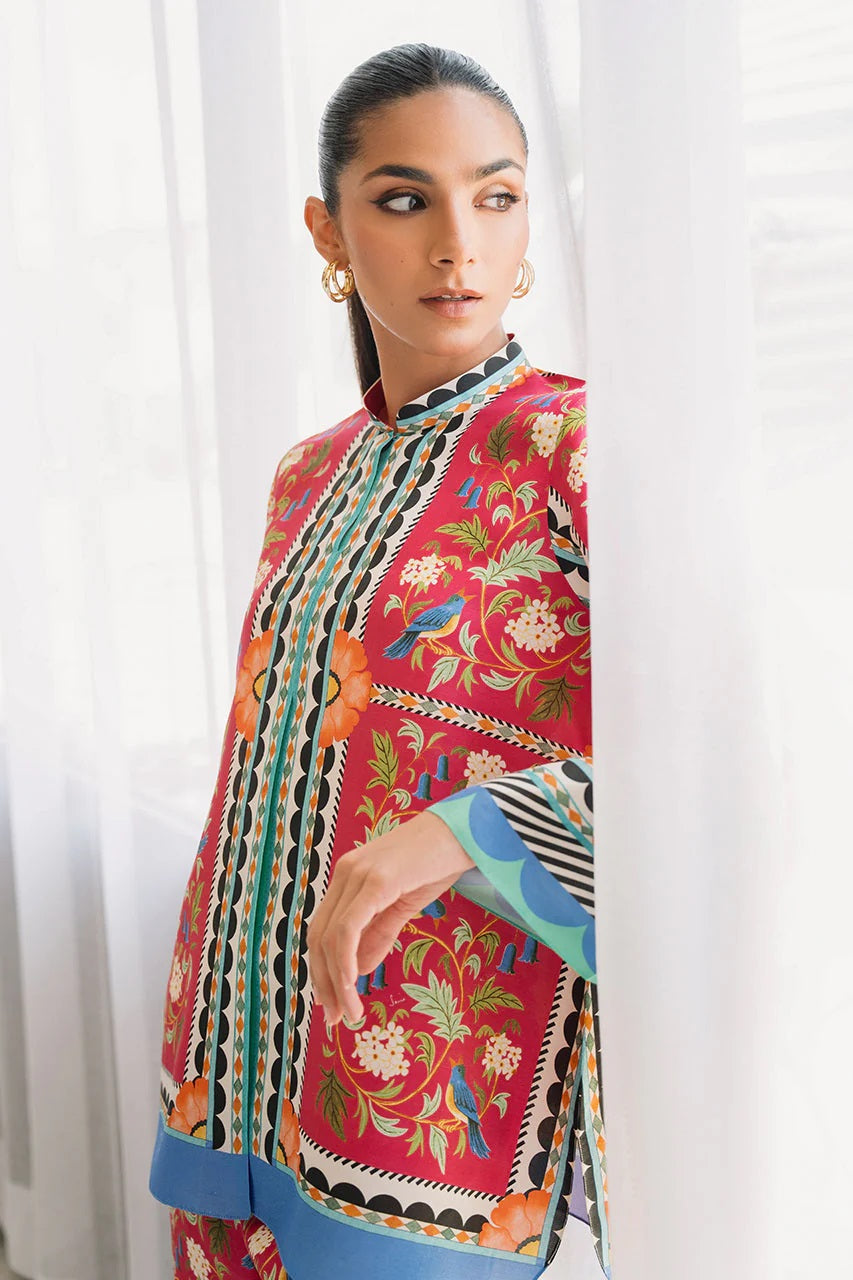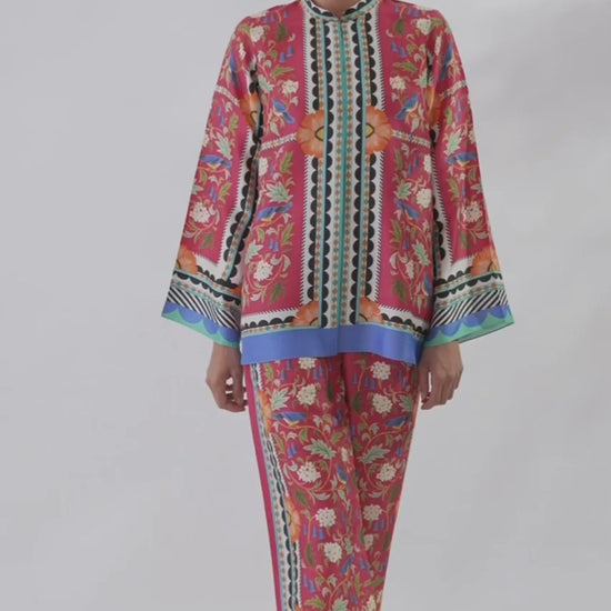 Crafted in a lightweight satin-blend fabric, this set features a high-neck tunic top with full sleeves and coordinating straight-fit trousers, each adorned with elaborate botanical prints framed in geometric borders. The look is accentuated with subtle contrast detailing at the hems, adding depth and luxury to the design.