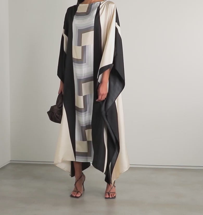 Exude timeless sophistication with this Elegant Black & Beige Geometric Pattern Kaftan Dress, featuring a stunning blend of neutral tones in a modern, structured print. The soft satin silk fabric drapes beautifully, creating a fluid, effortless silhouette that flatters all body types. The geometric design in shades of beige, grey, and white adds a contemporary edge, making this kaftan perfect for both casual elegance and evening wear. Pair it with gold jewelry and heels for a refined, minimalist look.