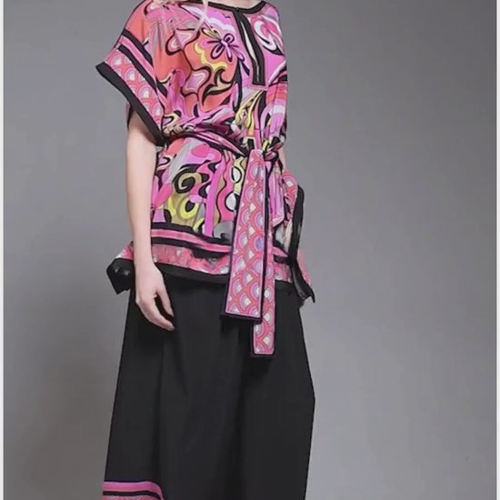 The flowy kaftan-style top with a belted waist drapes gracefully, allowing you to adjust your silhouette from relaxed to refined. Paired with wide-leg black trousers finished with a coordinating printed border, this ensemble creates an effortless statement of sophistication and power.