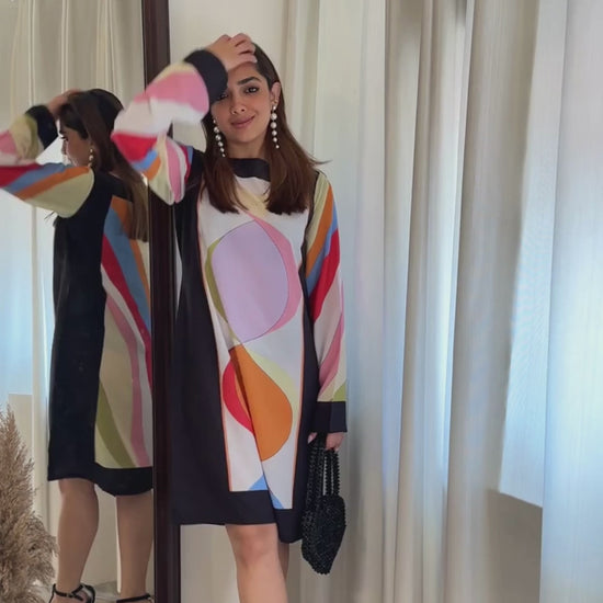 Step into a world of vibrant sophistication with this Geometric Colorblock Silk Shift Dress, designed to make a bold yet elegant statement. Crafted from premium satin silk, this dress features striking geometric patterns in vivid shades of orange, lilac, lime, and magenta — perfectly balanced against a sleek black base.