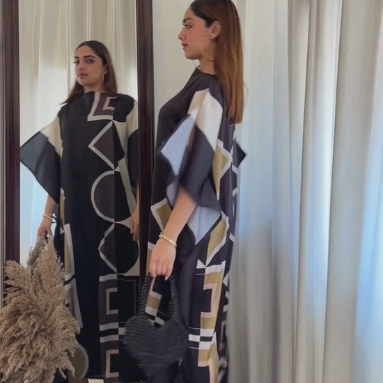 Step into sophistication with the Golden Geometry Kaftan Dress, a statement piece that celebrates artful design and refined luxury. Crafted from sumptuous satin, this flowing kaftan features a striking geometric pattern in rich shades of black, gold, and ivory, creating an effortlessly modern silhouette.