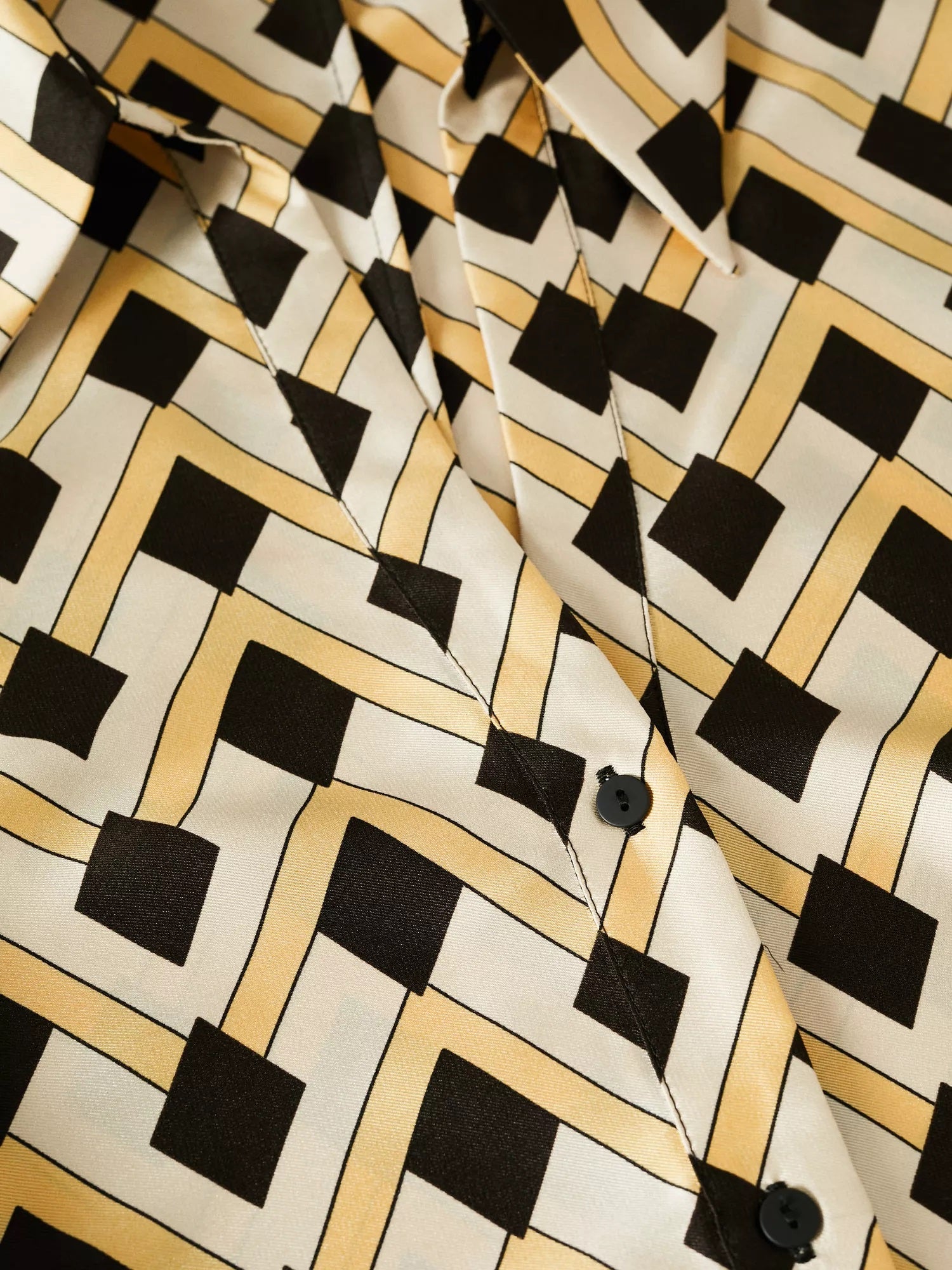Turn heads with the Golden Maze Satin Shirt Dress from LayrLuxe. Crafted from luxe satin fabric, this dress features an eye-catching geometric lattice pattern in gold, beige, and black, exuding timeless sophistication and modern flair.