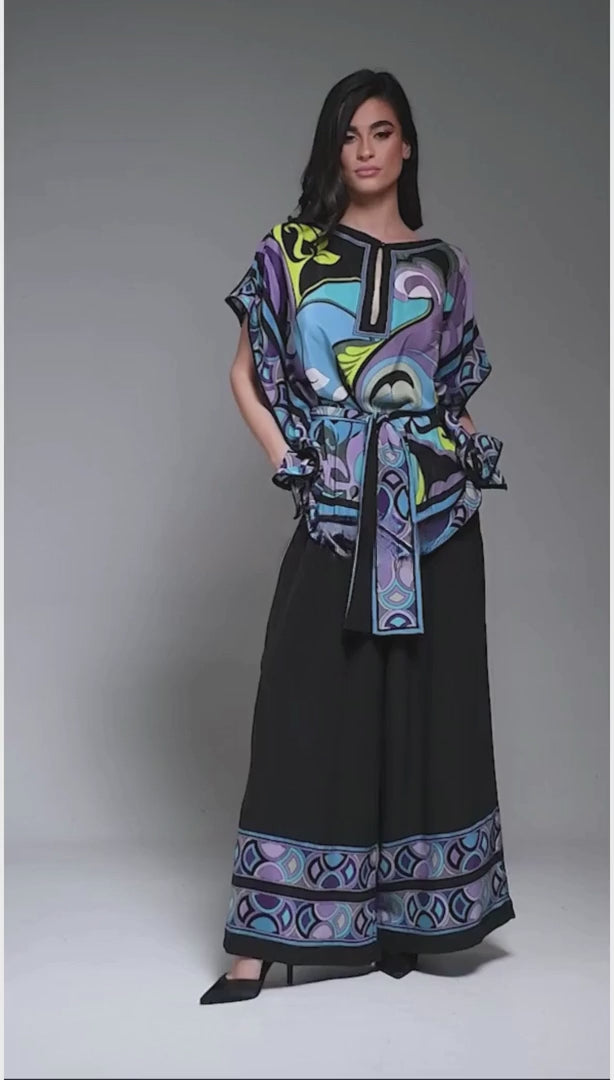 The kaftan-style top drapes beautifully with soft, flowing sleeves and a waist tie belt for a defined, flattering silhouette. It pairs with wide-leg black trousers, detailed with matching printed borders for a cohesive and chic finish. Ideal for evening events, resort dinners, or a touch of statement elegance anywhere you go.