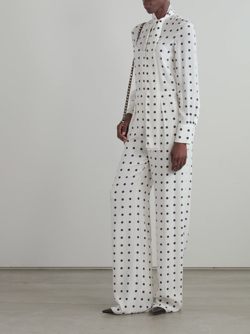 Crafted from premium satin blend fabric, the high-neck tie-detail blouse and flowy wide-leg trousers create a sleek silhouette that transitions seamlessly from day meetings to evening outings.
