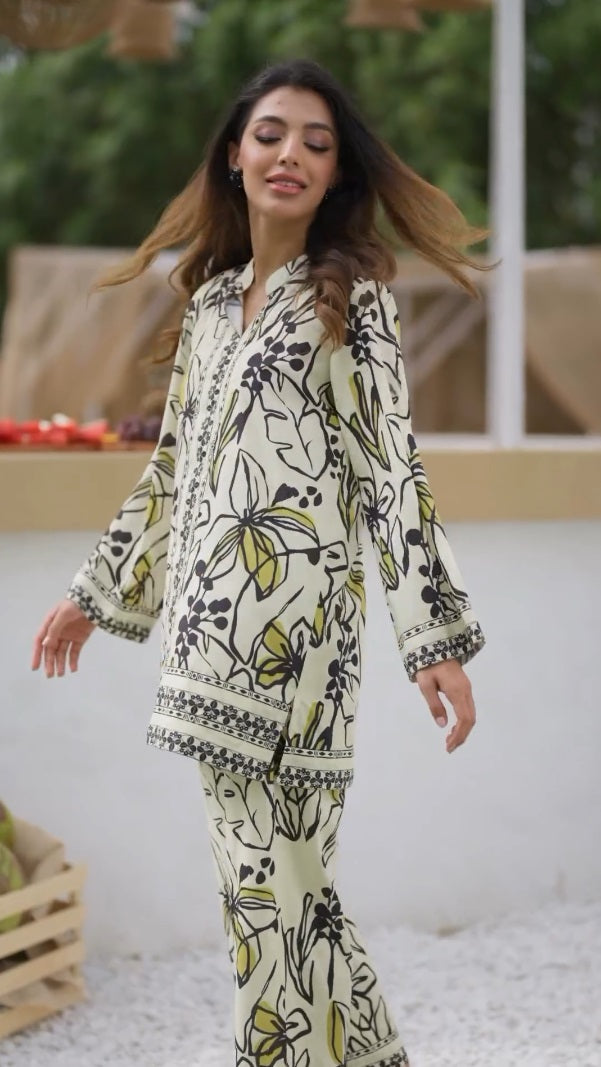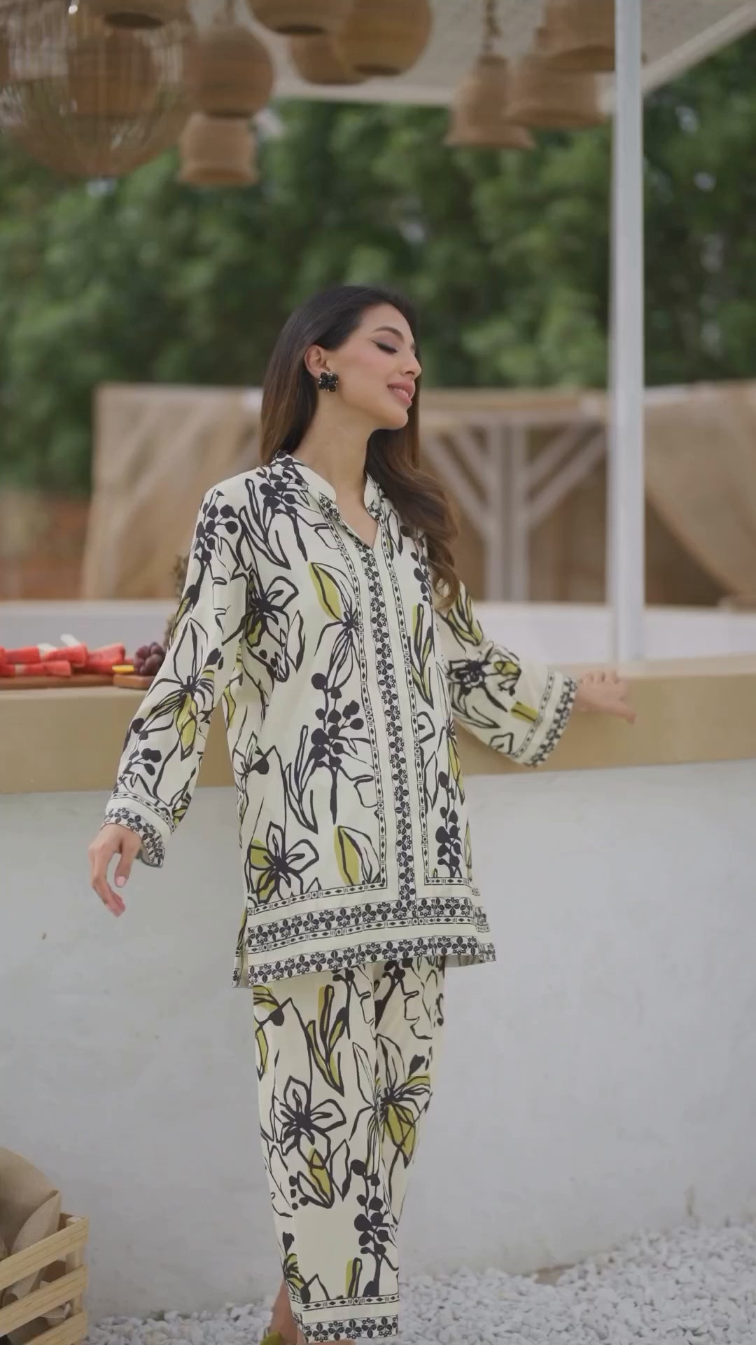 Effortlessly elegant and timelessly chic, the Noir Bloom Printed Co-ord Set by LayrLuxe captures the essence of understated sophistication. Crafted on a soft cream base, the ensemble features artistic black floral motifs with mustard accents, creating a perfect balance of minimalism and luxury.