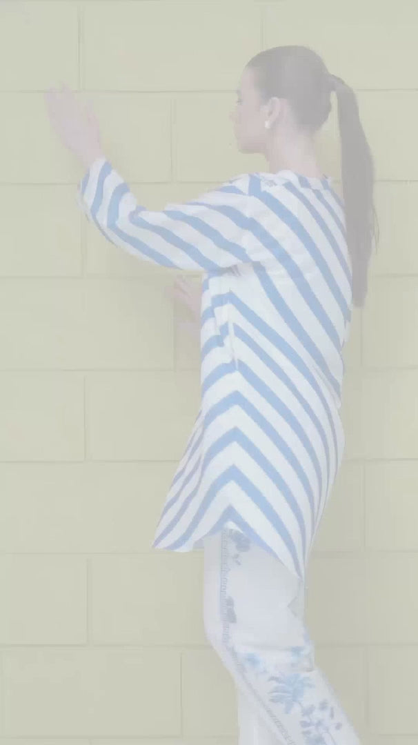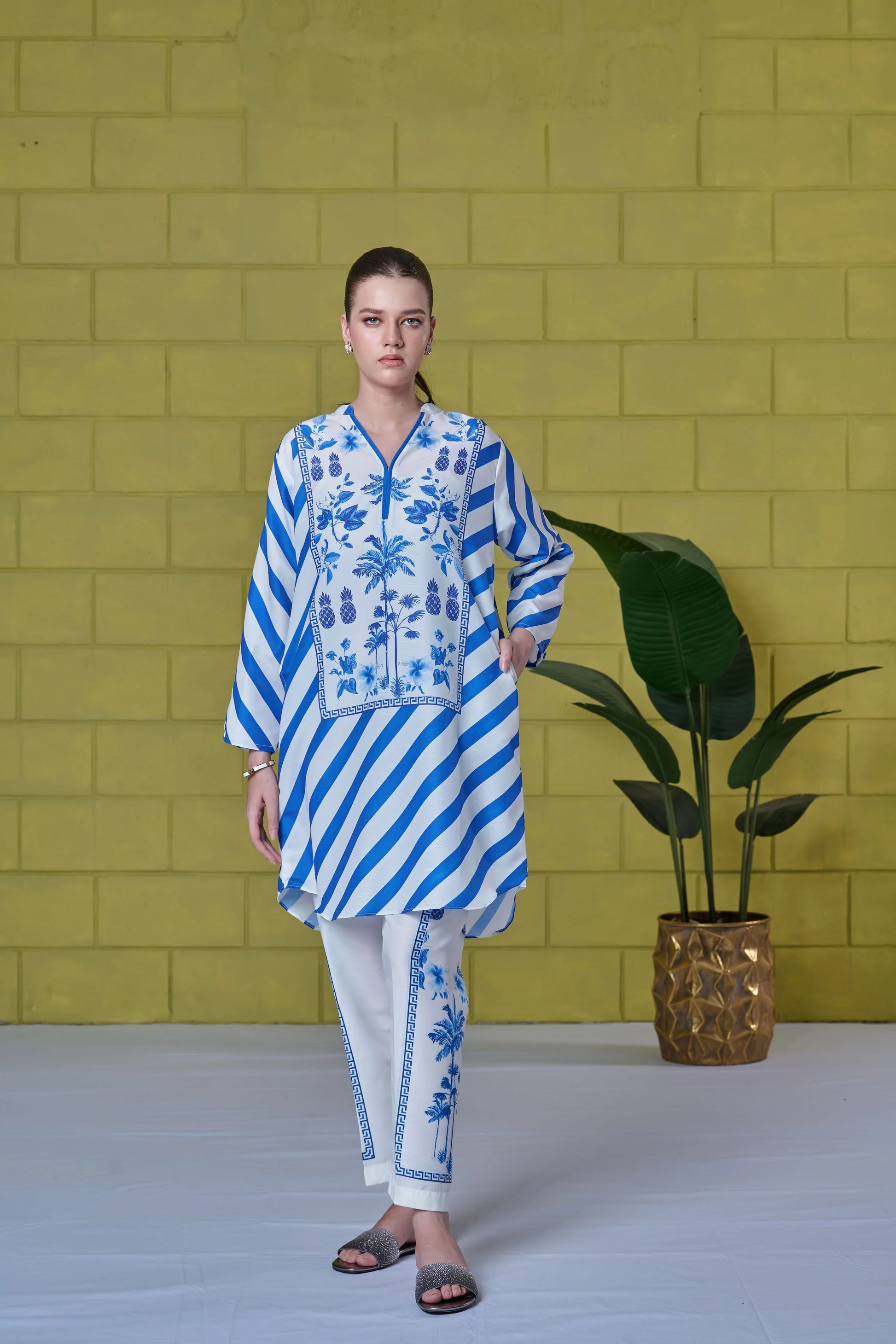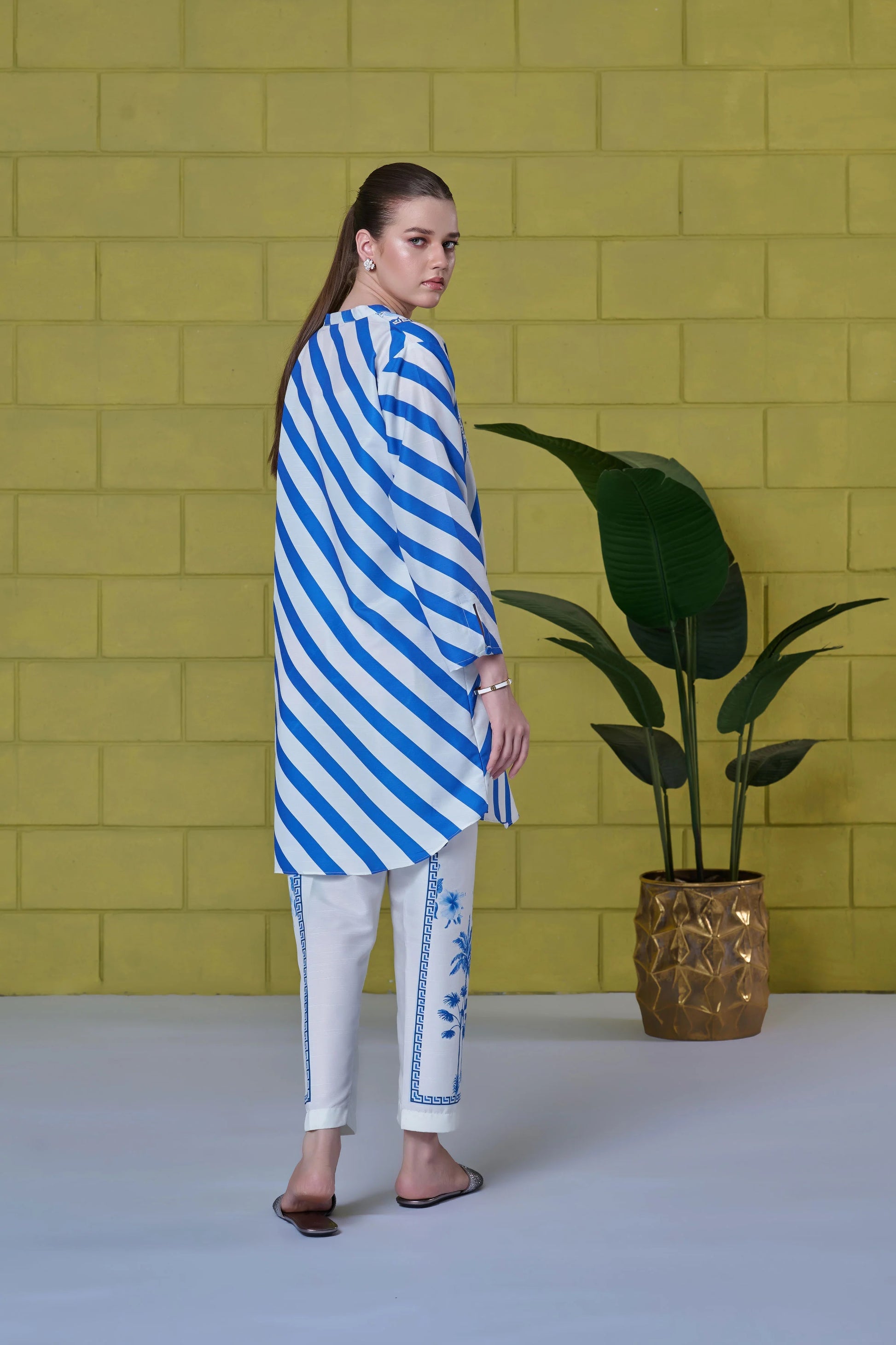 The A-line tunic features bold diagonal stripes contrasted with intricate blue botanical motifs, while the straight-fit trousers carry complementary border detailing for a cohesive, elevated look. Designed in premium satin-blend fabric, it ensures both comfort and fluid movement.