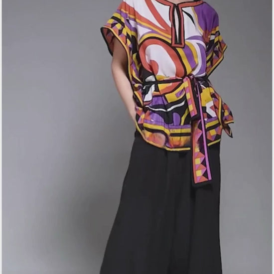 The flowy kaftan-style top features a relaxed silhouette with an elegant neckline and a belted waist that flatters your figure while maintaining an easy, effortless vibe. The matching wide-leg trousers showcase a coordinated border print, completing the look with a touch of artistic symmetry.