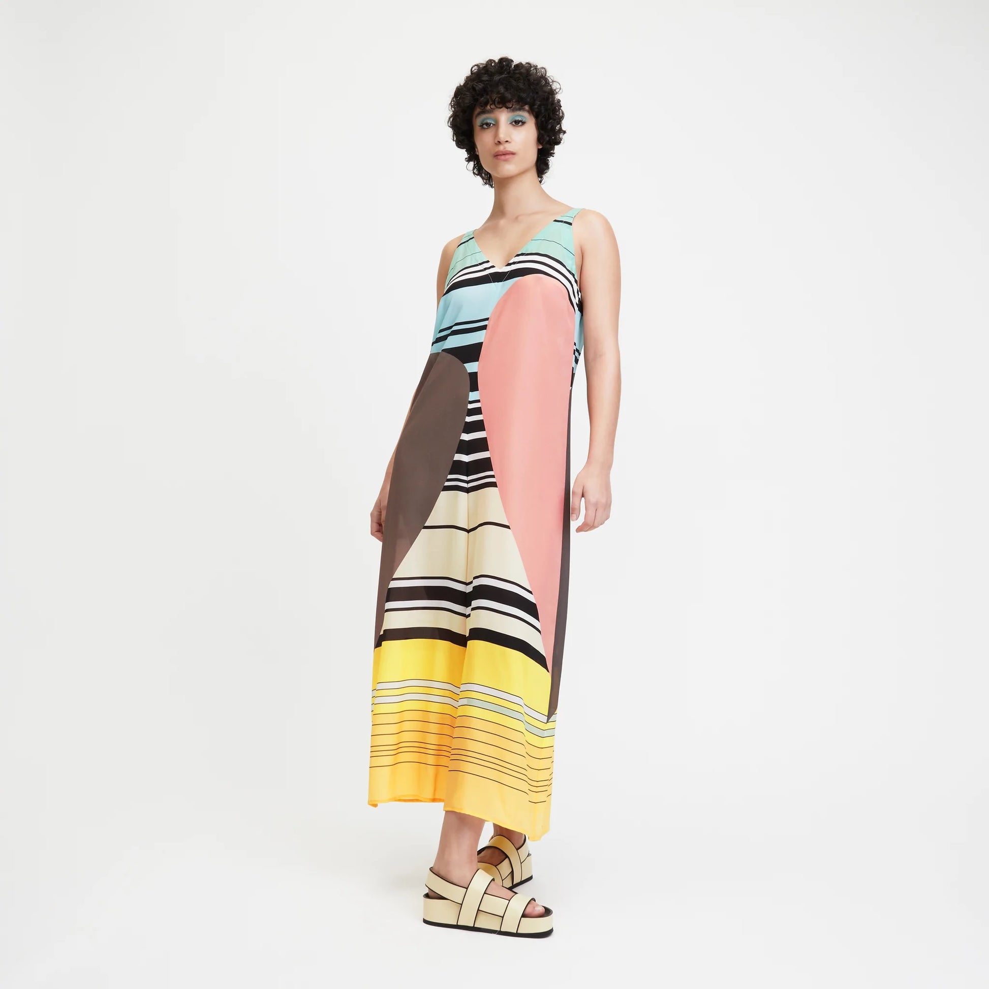 Sunset Spectrum Silk Maxi Dress – Modern Geometry Meets Summer Ease