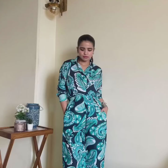 Tropical Swirl Print Co-ord Set – Vibrant Elegance in Teal & Navy