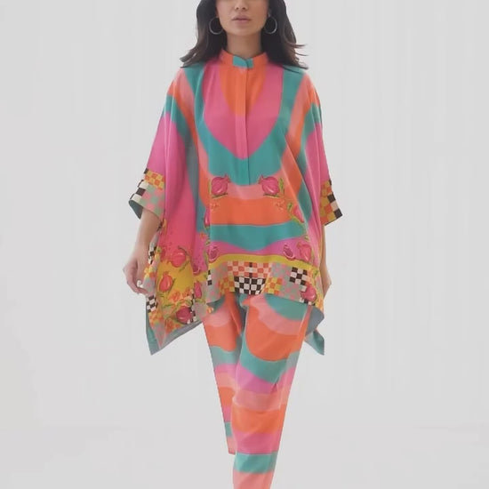 Bring vibrance to your wardrobe with the Tropicana Muse Abstract Co-ord Set by LayrLuxe — a celebration of color, creativity, and effortless sophistication. Designed for the modern woman who embraces statement style, this set features bold wave-inspired stripes in a stunning palette of coral, mint, orange, and fuchsia — elevated by artistic rose motifs and checkerboard accents along the hemline.